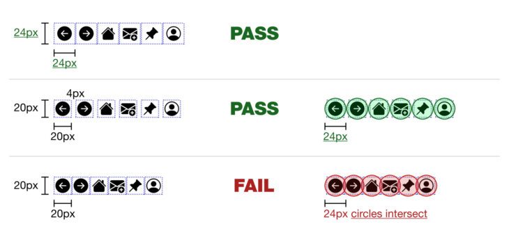 When the click target of an interactive element is smaller than 24 × 24 pixels, it is considered undersized. In this case, it is necessary to check whether there is sufficient spacing by drawing an imaginary 24-pixel circle around the undersized element.
