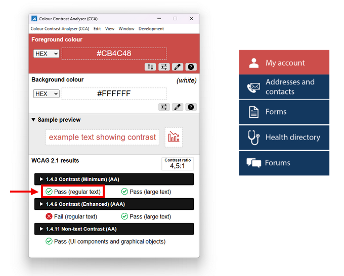 The minimum contrast ratio required for text is 4.5 with the background colour.