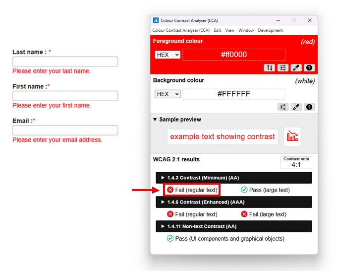 This tool allows you to manually enter colors using their hexadecimal codes or select them using an eyedropper. Compliance results are displayed directly within the tool.