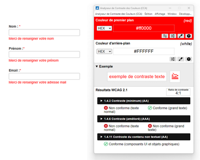 Afin de tester les contrastes, utiliser par exemple l’outil Colour Contrast Analyser disponible en libre téléchargement.